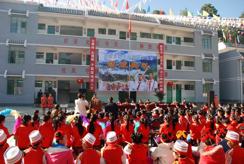 11月11日上午,保山市龙陵县龙新乡菜子地村和过年过节一样热闹,小山坳上新建成的菜子地苏泊尔小学新校园里,少先队员敲响热烈的鼓乐,一栋3层教学楼和左侧综合附属楼上彩旗飘飘,村民像过节一般来到校园里,参加新校园落成典礼。