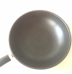 平底锅底部受热后发生膨胀,会产生一定量的内凸,底部形成球面.在设计时我们要求上凸高度在3MM左右是正常;用时可旋转锅具、翻动食物来达到锅内油量均衡